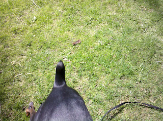 See the further tree? That's where she was when I pressed the "take picture" button. She's a fast one, my Elka! Her send away (go away? Send out? I forget the proper term. It isn't outrun, as that involves sheep, typically) isn't too bad either. She doesn't mind being interrupted, as she has a notion that she'll be allowed to go back to what she was doing (it's just the Wikipedia article, but you can read about the Premack Principle if you'd like).